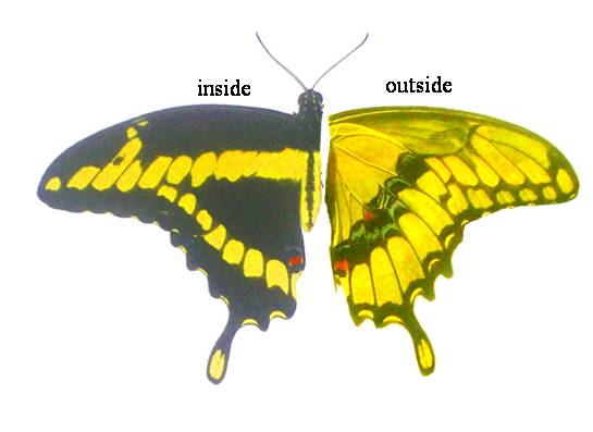 Description: 3/8-5 1/2" (86-140 mm). Very large. Long, dark, spoon-shaped tails have yellow center. Dark brownish-black above with 2 broad bands of yellow spots converging at tip of FW. Orange spot at corner of HW flanked by blue spot above; both recur below, but blue continuing in chevrons across underwing, which also has orange patch. Otherwise, yellow below with black veins and borders. Abdomen yellow with broad black midline tapering at tip; notch on top of abdomen near rear. Thorax has yellow lengthwise spots or stripes. This is considered to be America’s largest butterfly